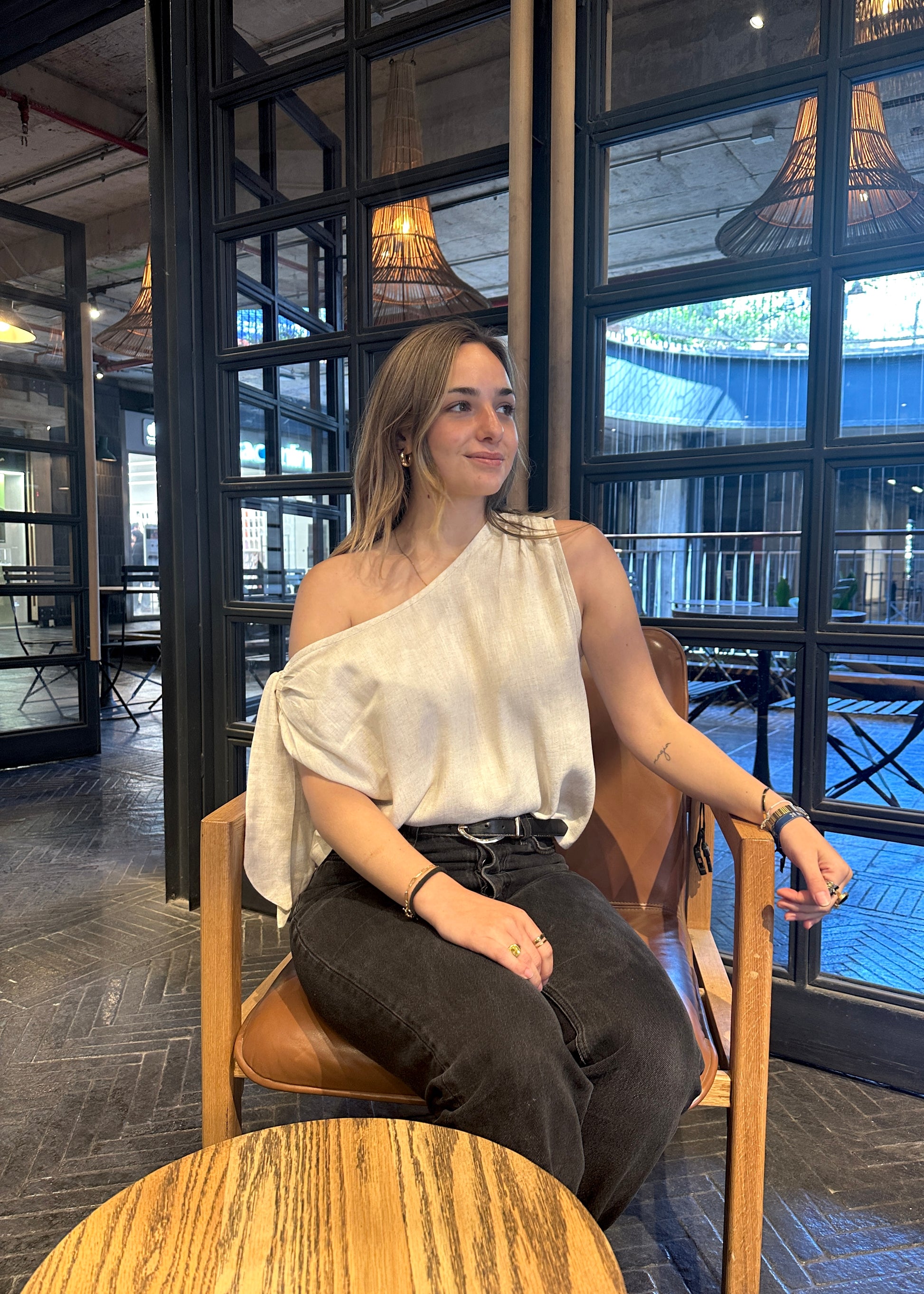 Blusa confeccionada en lino, diseñada con escote asimétrico que aporta movimiento y sofisticación.